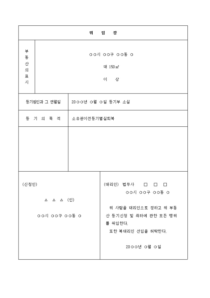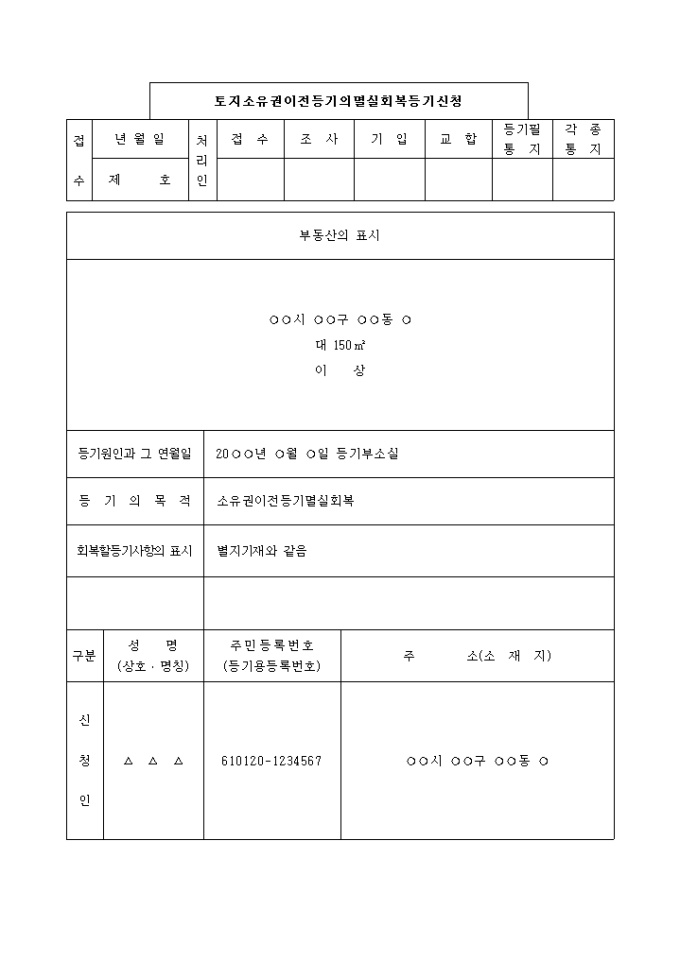 등기원인과 그 연월일 : 20○○년 ○월 ○일 등기부소실
