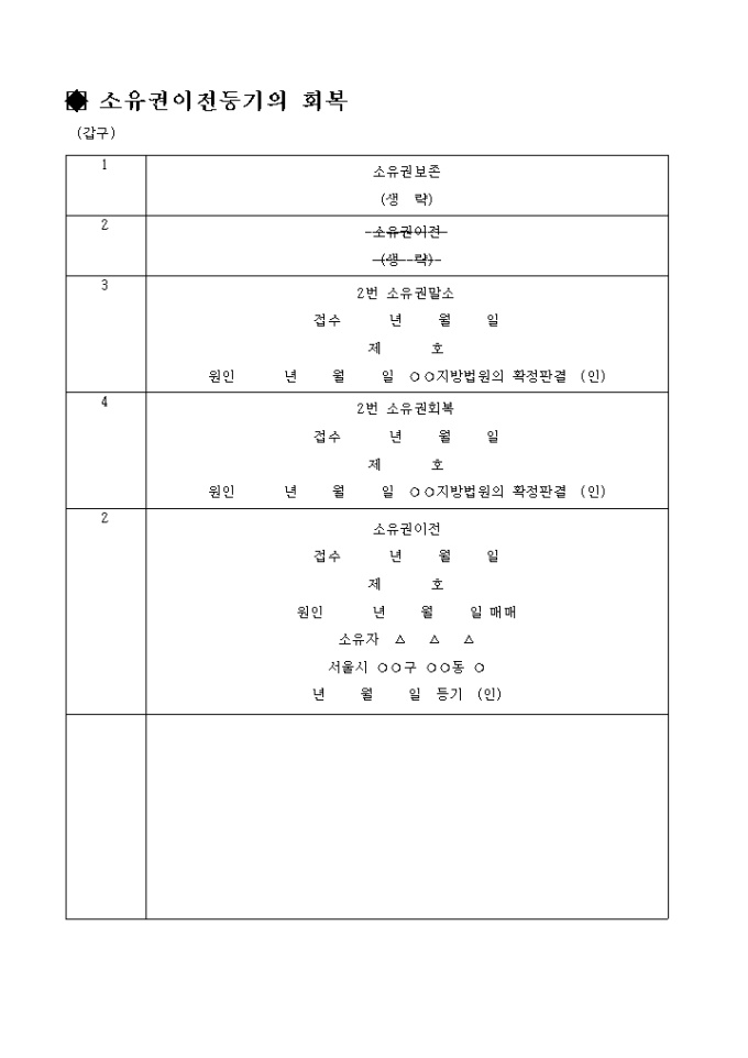 토지소유권이전말소회복등기신청서(소유권이전등기의 회복)