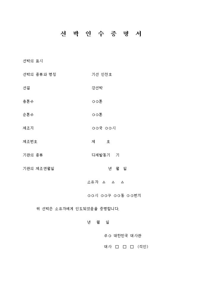 9,000원/월선박인수증명서 입니다. 선박의 표시 선박의 종류와 명칭 기선 인천호 선질 강선박 총톤수 톤 순톤수 톤 제조지 국 시 ...