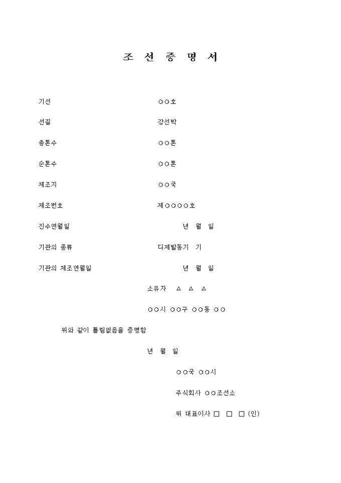 조선증명서 입니다. 기선 ○○호 선질 강선박 총톤수 ○○톤 순톤수 ○○톤 제조지 ○○국 제조번호 제○○○○호
