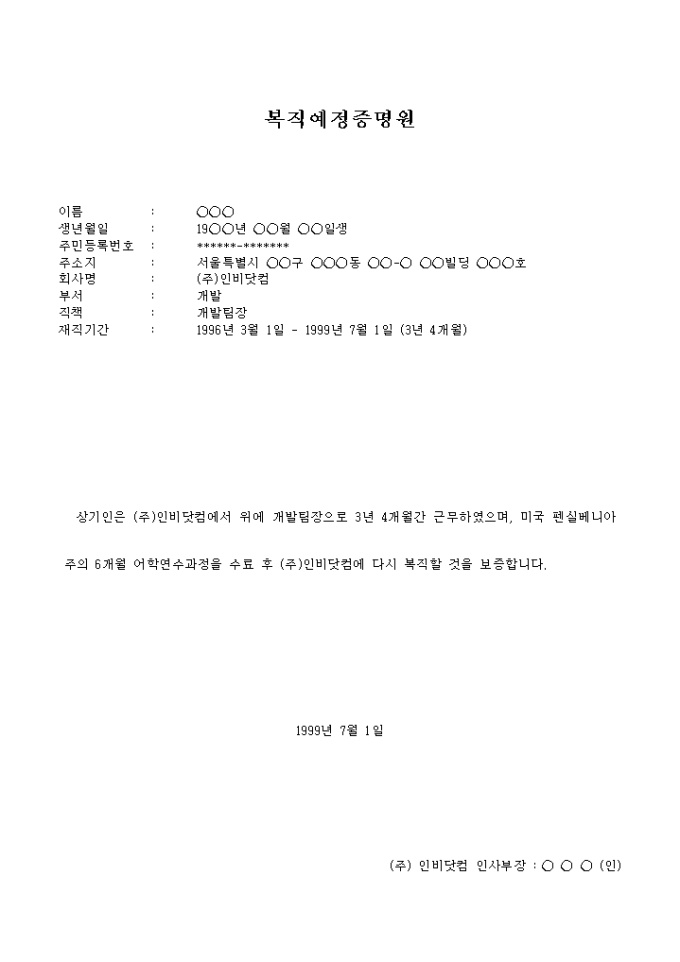 9,000원/월회사에서 특정직급으로 특정기간동안 근무한 사원이, 어학연수과정을 수료 후 다시 복직할 것을 보증하는 증명원 양식입니다.