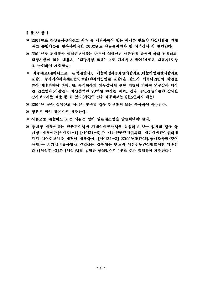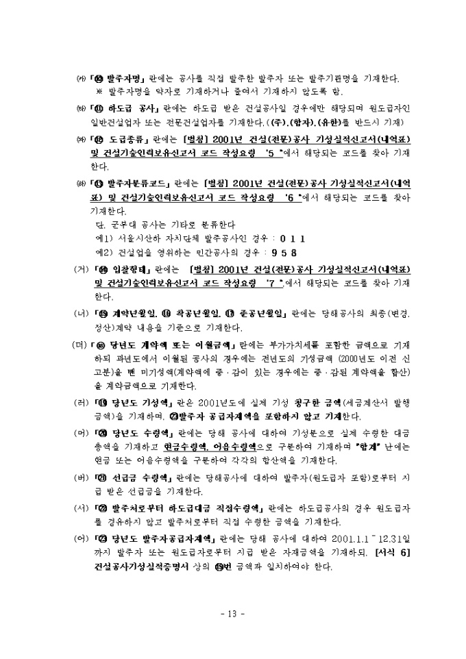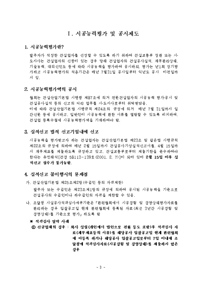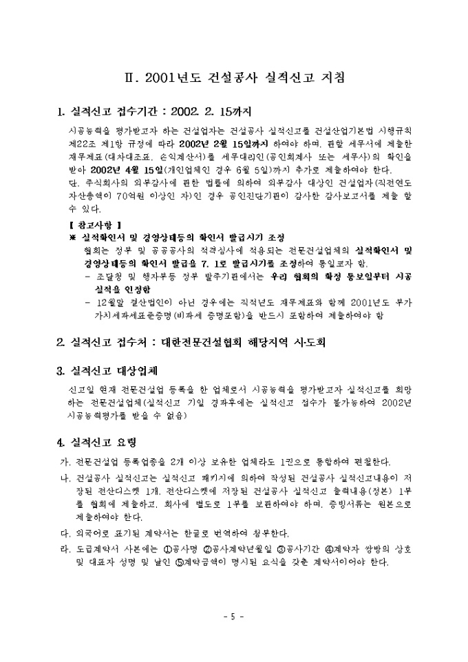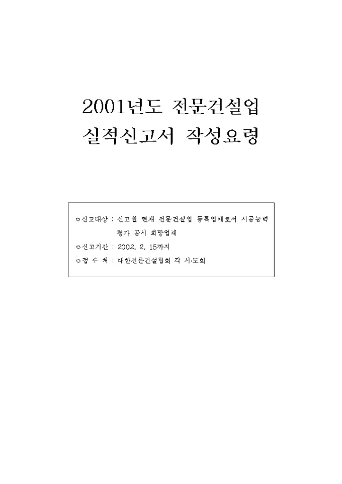 9,000원/월대한전문건설협회에서 제공되는 2001년도 전문건설업 실적신고서 작성요령입니다.자세한 내용은 다음을 참고하세요. Ⅰ. 시공능력평가 및 공시제도 Ⅱ. 2001년도 건설공사 실적신고 지침 Ⅲ. 건설공사 실적신고 양식 기재요령 및 증빙서류 Ⅳ. 기 타 사 항