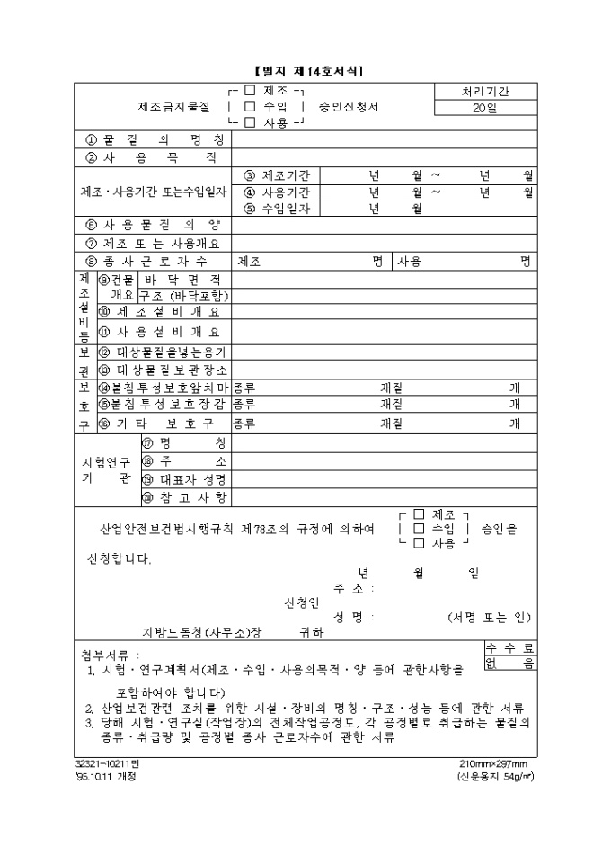 산업안전보건법시행규칙 제78조의 규정에 의하여 (제조,수입,사용) 승인을 신청할 때 쓰이는 "제조 금지물질(제조,수입,사용) 승인신청서" 양식입니다.