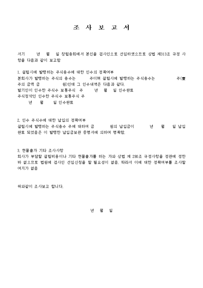 선임된 검사인이 상법 제313조 규정 사항을 다음과 같이 보고할 경우 사용하시는 서식입니다.