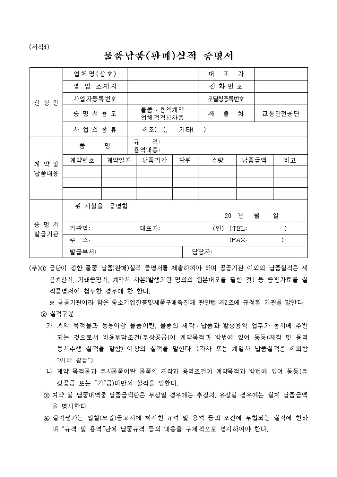 9,000원/월물품 납품 실적에 관한 증명서 양식으로 신청인, 계약 및 납품내용, 증명서 발급기관등이 명시되어 있습니다.