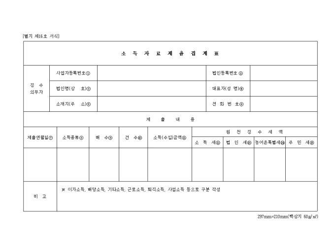 징수 의무자의 사항과 제출내용으로 구성된 사업자 소득자료 제출을 집계하기 위한 양식입니다.