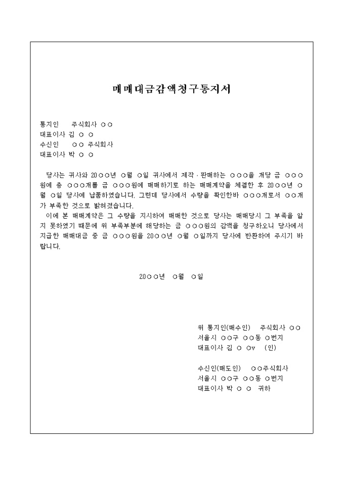 9,000원/월매매대금감액청구통지서 예제 입니다. 당사는 귀사와 20○○년 ○월 ○일 귀사에서 제작 판매하는 ○○○을 개당 금 ○○○원에 총 ○○○개를 금 ○○○원에 매매하기로 하는 매매계약을 체결한 후 20○○년 ○월 ○일 당사에 납품하였습니다. 그런데 당사에서 수량을 확인한바 ○○○개로서 ○○개가 부족한 것으로 밝혀졌습니다. ...