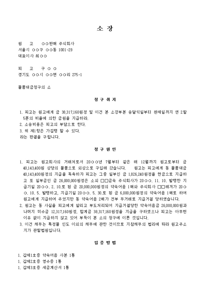 물품대금청구의 소 청 구 취 지 1. 피고는 원고에게 금 38, 317, 160원정 및 이건 본 소장부본 송달익일부터 완제일까지 연 2할 5푼의 비율에 의한 금원을 지급하라. 2. 소송비용은 피고의 부담으로 한다. 3. 위 제1항은 가집행 할 수 있다. 라는 판결을 구합니다.