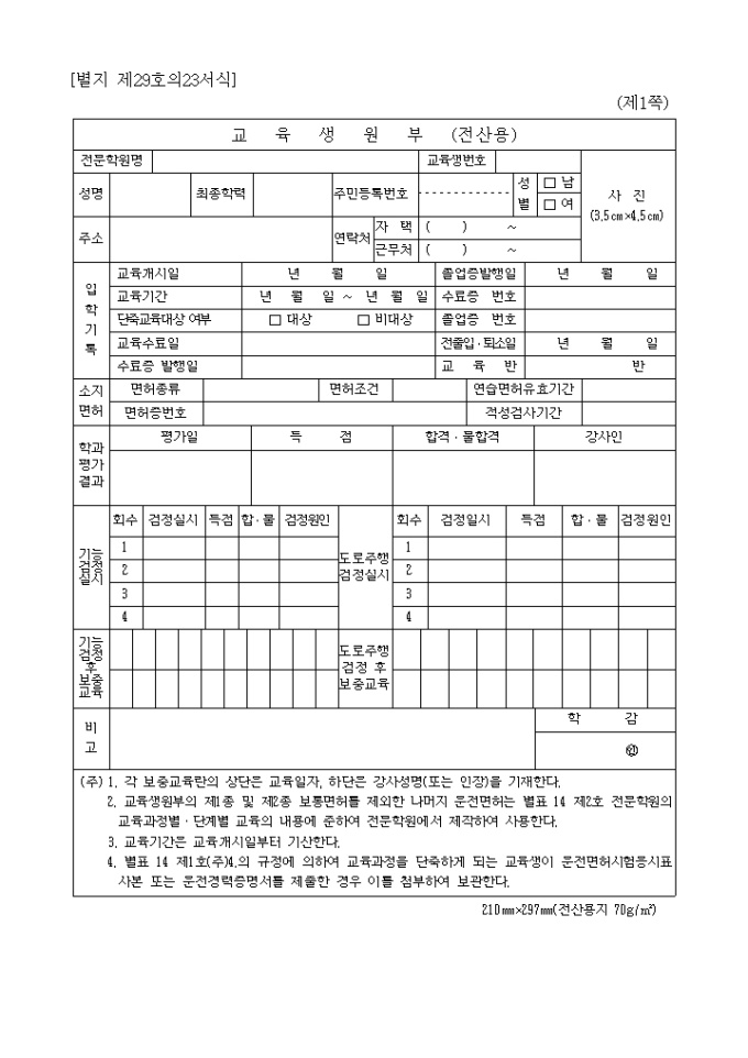 자동차 운전전문학원에서 사용하는 전산용 교육생 원부입니다.