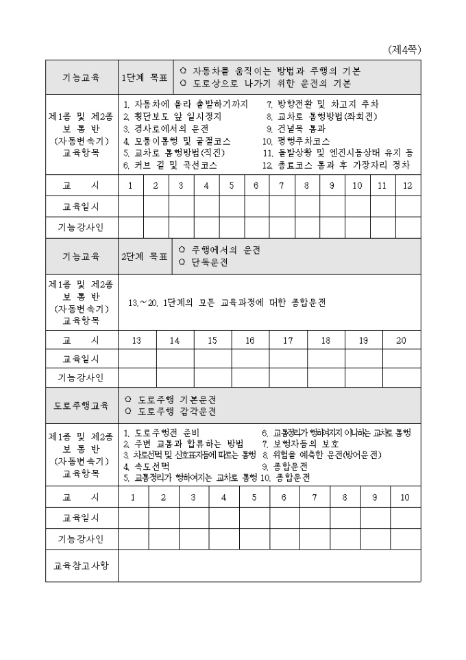 학과교육, 기능교육, 도로주행교육, 참고사항등을 기재할 수 있습니다.