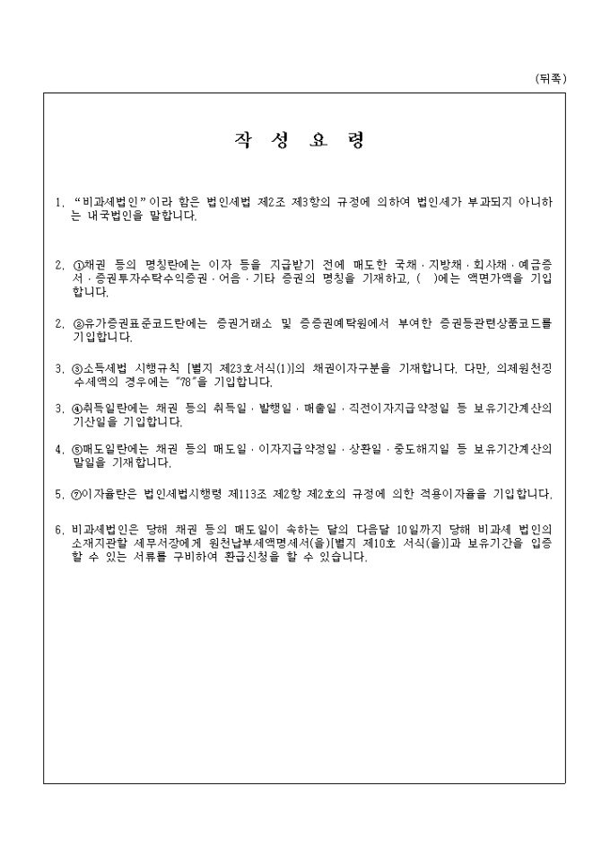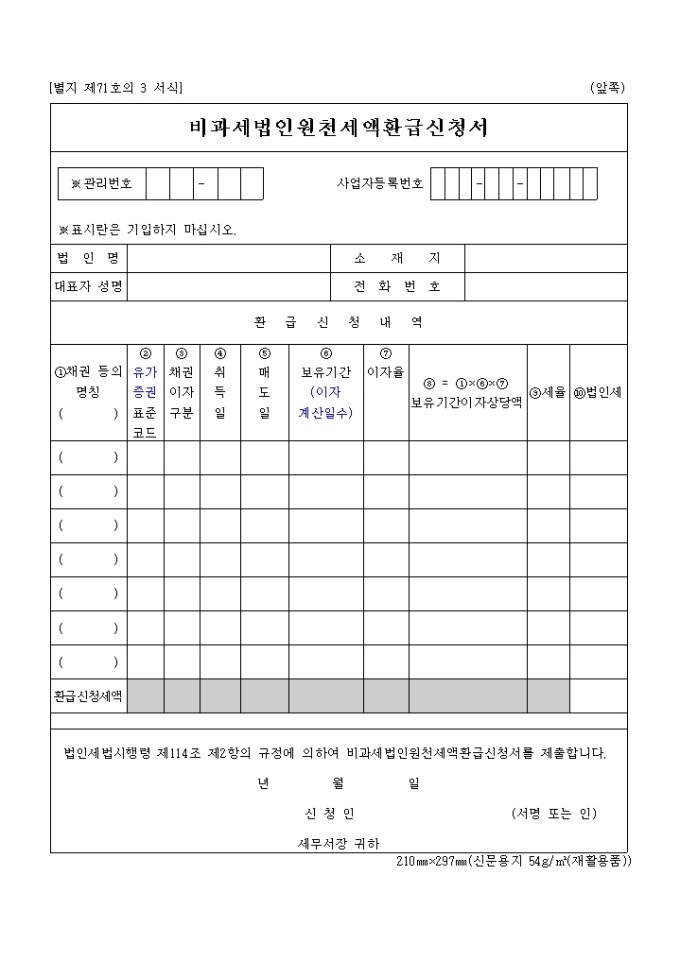 법인세법시행령 제114조 제2항의 규정에 의하여 비과세법인원천세액환급신청서를 제출하실때 사용하는 양식입니다.