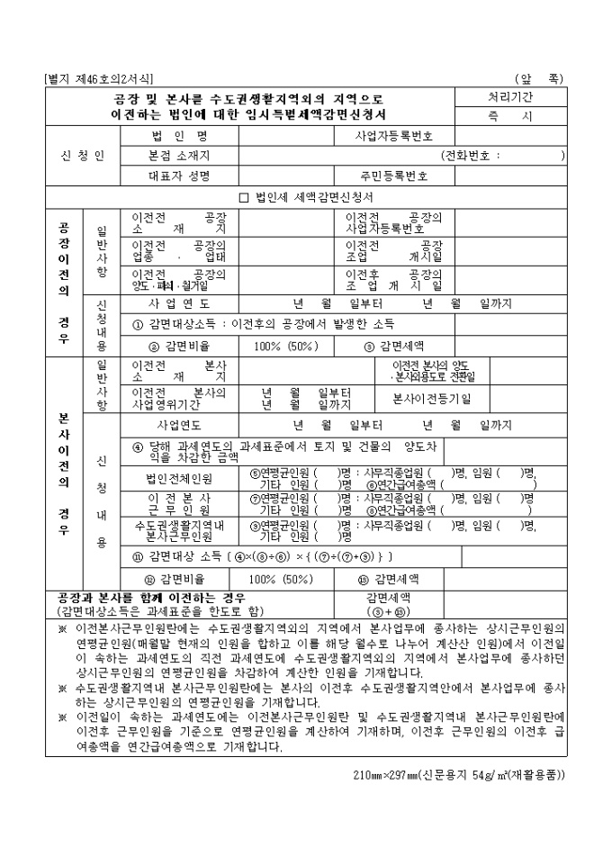 공장 및 본사를 수도권생활지역외의 지역으로 이전하는 법인에 대한 임시특별세액감면신청서(별지 제46호의2서식)