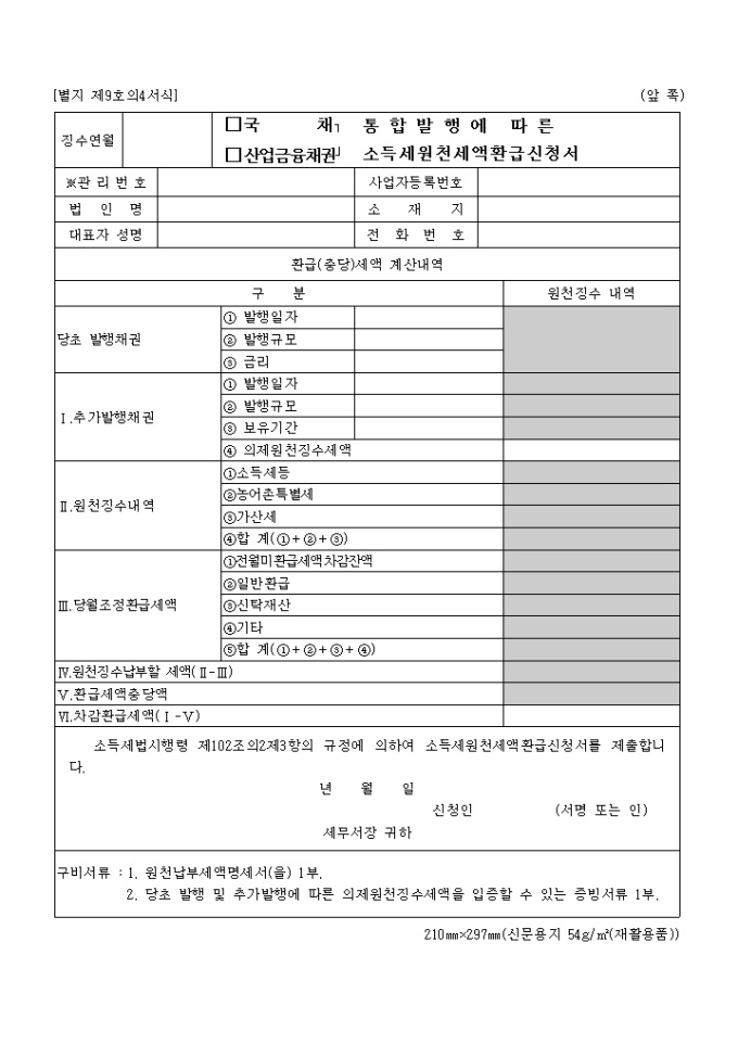 국채통합발행에따른소득세원천세액환급신청서 양식입니다.