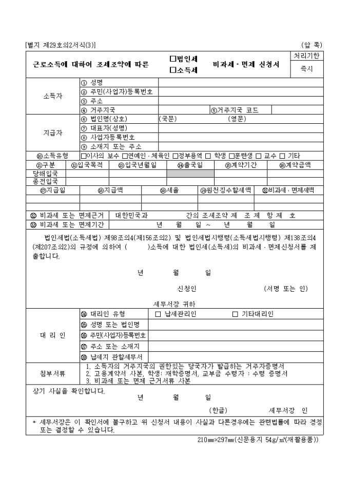 근로소득에대하여조세조약에따른법인세비과세면제신청서 양식입니다.