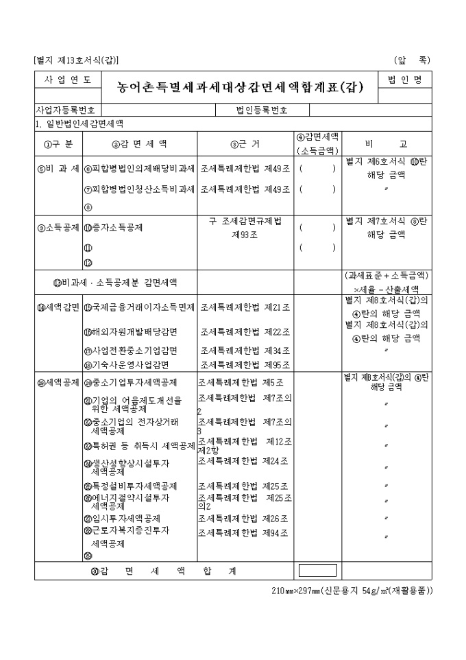 농어촌특별세과세대상감면세액합계표(갑) 양식입니다.