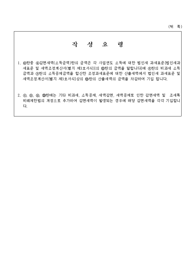 1. ⑬란중 ④감면세액(소득금액)란의 금액은 각 사업연도 소득에 대한 법인세 과세표준[법인세과세표준 및 세액조정계산서(별지 제3호서식)]의 란의 금액을 말합니다]에 ⑤란의 비과세 소득금액과 ⑨란의 소득공제금액을 합산한 조정과세표준에 대한 산출세액에서 법인세 과세표준 및 세액조정계산서[별지 제3호서식]상의 란의 산출세액의 금액을 차감하여 기입 합니다.