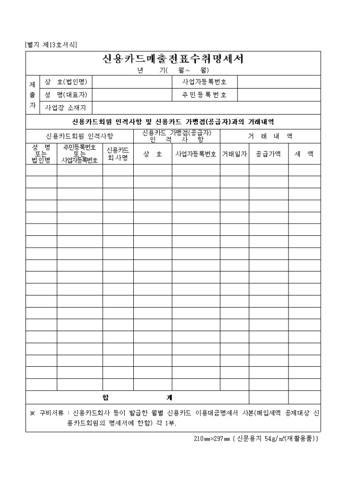 신용카드회원 인적사항 및 신용카드 가맹점(공급자)과의 거래내역의 상세 항목으로 구성된 양식입니다.