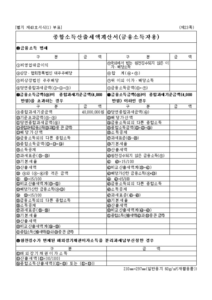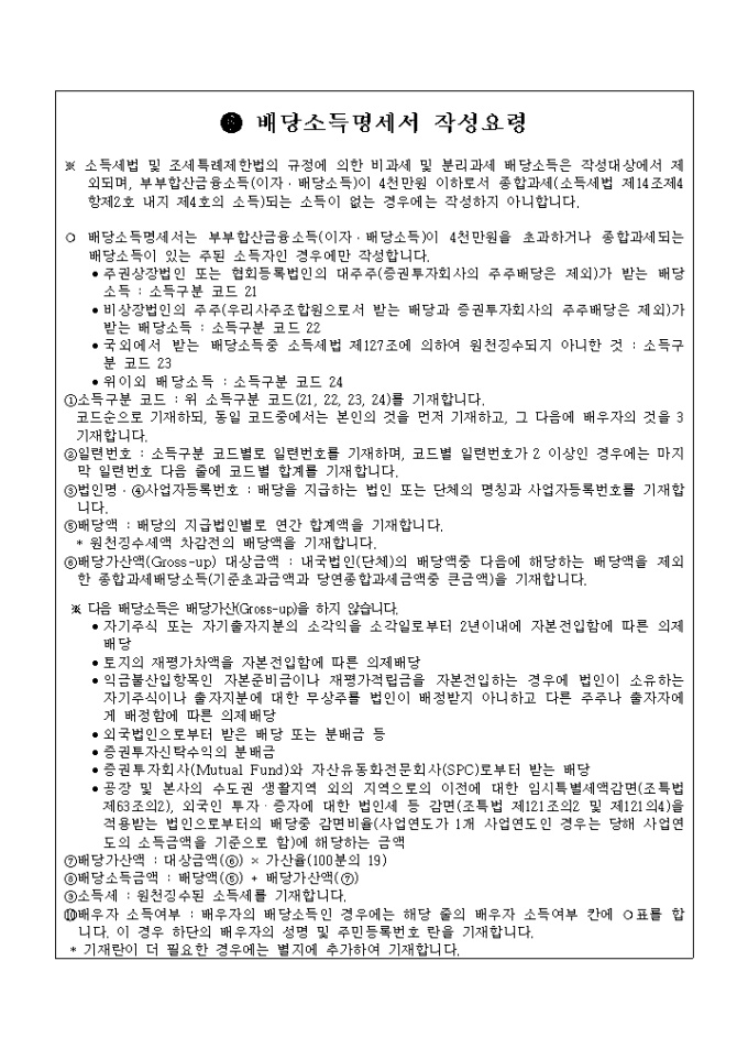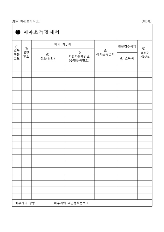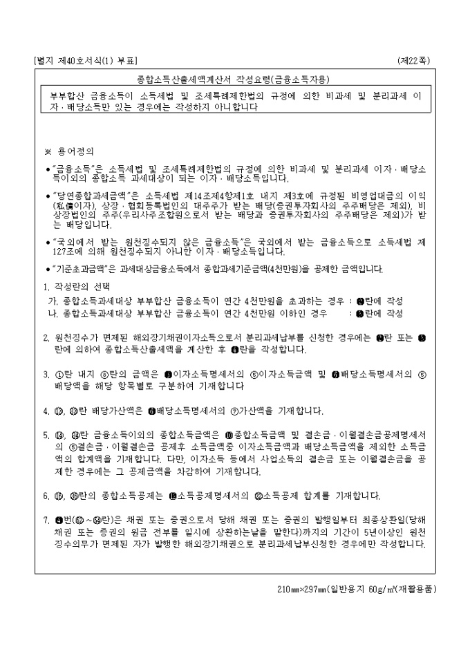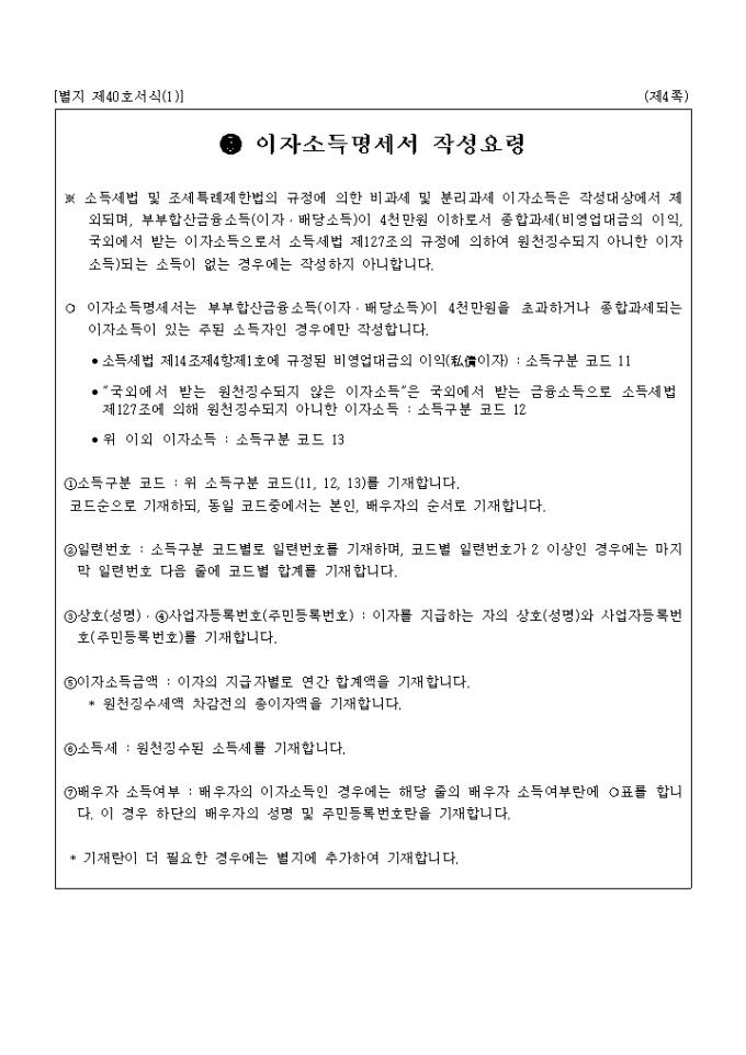 ※ 소득세법 및 조세특례제한법의 규정에 의한 비과세 및 분리과세 이자소득은 작성대상에서 제외되며, 부부합산금융소득(이자·배당소득)이 4천만원 이하로서 종합과세(비영업대금의 이익, 국외에서 받는 이자소득으로서 소득세법 제127조의 규정에 의하여 원천징수되지 아니한 이자소득)되는 소득이 없는 경우에는 작성하지 아니합니다.