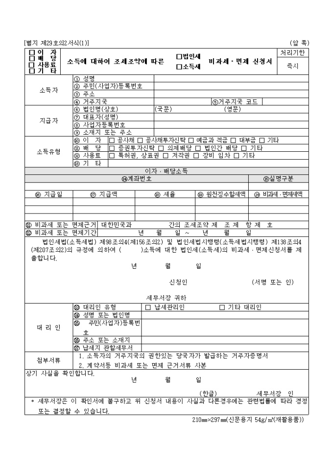 법인세법(소득세법) 제98조의4(제156조의2) 및 법인세법시행령(소득세법시행령) 제138조의4(제207조의2)의 규정에 의하여 ( )소득에 대한 법인세(소득세)의 비과세․면제신청서를 제출하실때 사용하는 양식입니다.