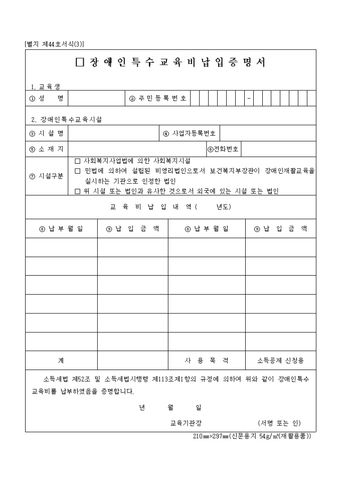 소득세법 제52조 및 소득세법시행령 제113조제1항의 규정에 의하여 위와 같이 장애인특수교육비를 납부하였음을 증명하실때 사용하는 양식입니다.