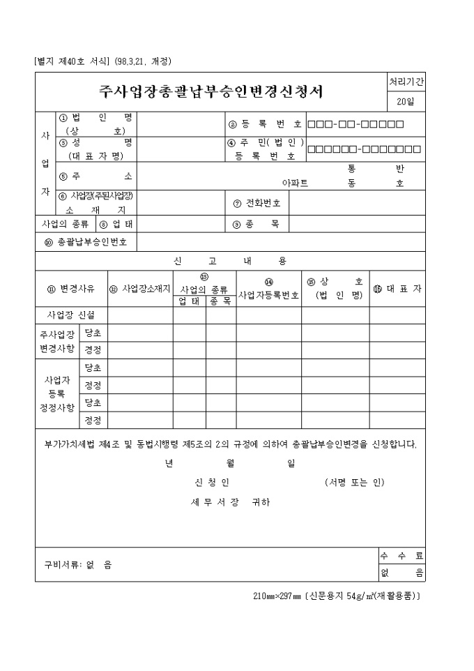 부가가치세법 제4조 및 동법시행령 제5조의 2의 규정에 의하여 총괄납부승인변경을 신청하실때 사용하는 양식입니다.