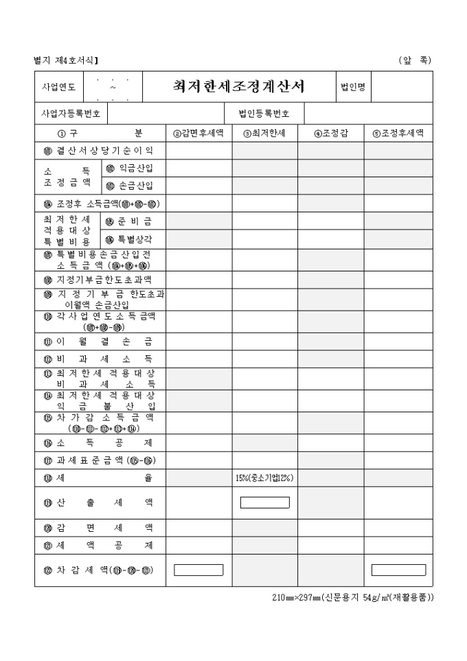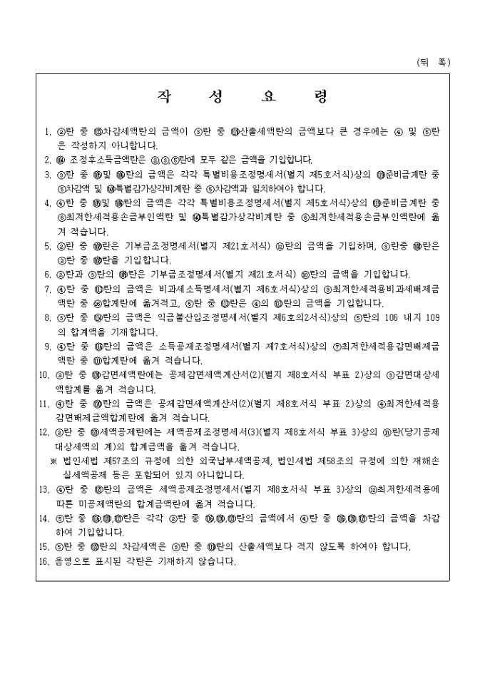 4. 란 중 및 란의 금액은 각각 특별비용조정명세서(별지 제5호서식)상의 준비금계란 중 최저한세적용손금부인액란 및 특별감가상각비계란 중 최저한세적용손금부인액란에 옮겨 적습니다.
