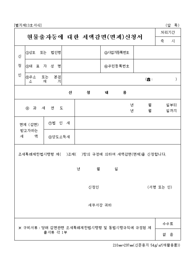 현물출자등에대한세액감면(면제)신청서 양식입니다.