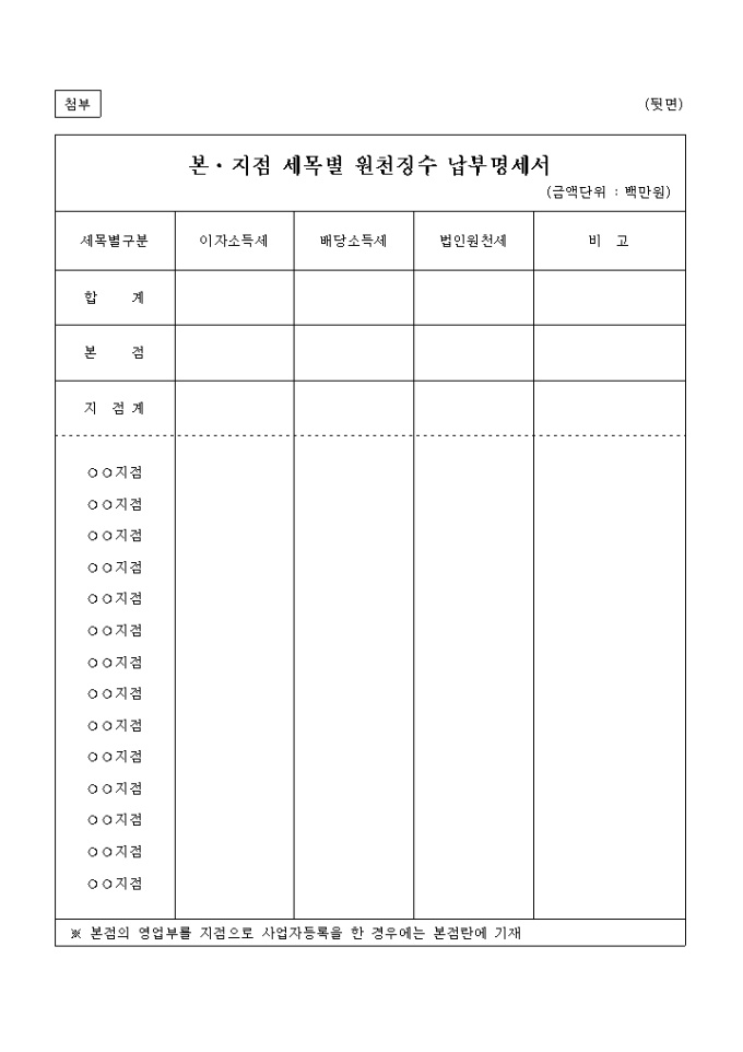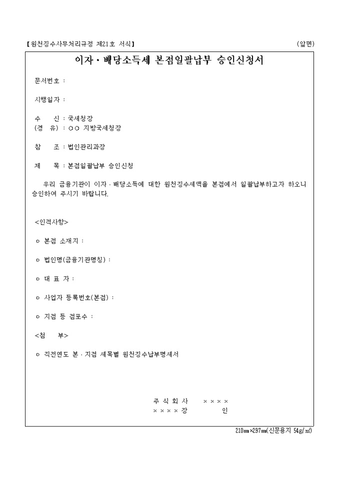 우리 금융기관이 이자․배당소득에 대한 원천징수세액을 본점에서 일괄납부하고자 하오니 승인하여 주시기 바랍니다.