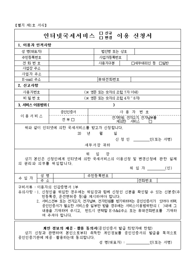 인터넷에 의한 국세서비스를 받고자 신청하실때 사용하는 양식입니다.