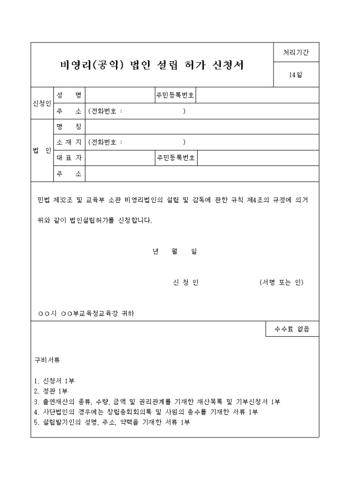 민법 제32조 및 교육부 소관 비영리법인의 설립 및 감독에 관한 규칙 제4조의 규정에 의거 법인설립허가를 신청할 때 사용하는 양식입니다.
