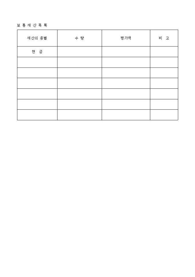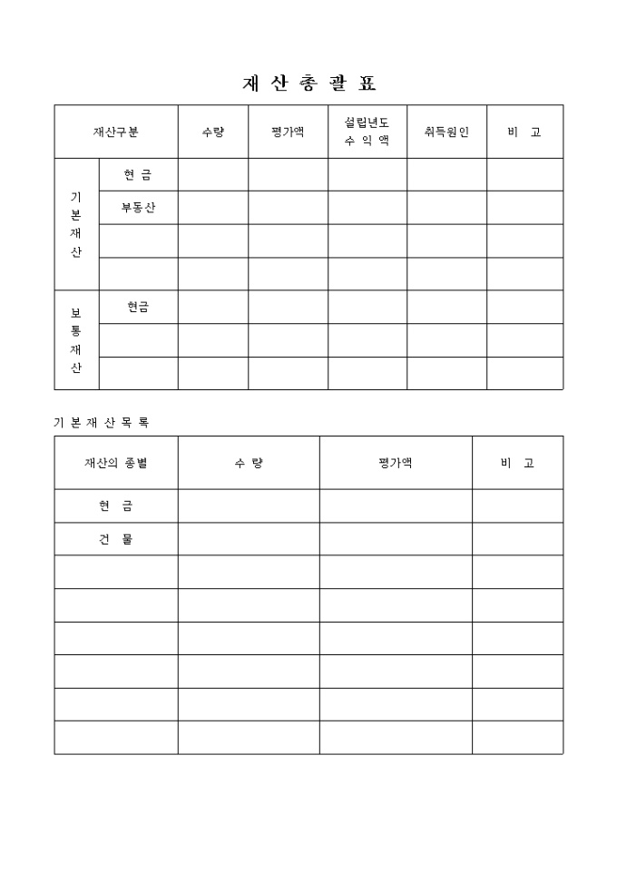 9,000원/월기본재산과 보통재산으로 분류하여 명시한 재산총괄표, 재산의 종별, 수량, 평가액으로 기록되는 기본재산목록, 보통재산 목록 양식입니다.