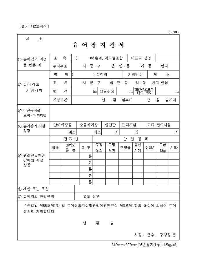 9,000원/월수산업법 제55조제1항 및 유어장의지정및관리에관한규칙 제2조제1항의 규정에 의하여 유어장의 지정을 받고자 신청할 때 사용하는 "별지제2호 유어장지정서" 양식입니다.