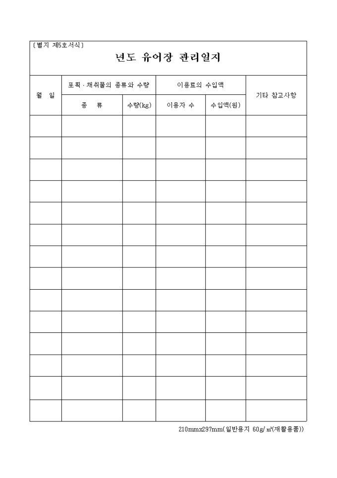 별지 제5호 년도 유어장 관리일지 양식입니다.