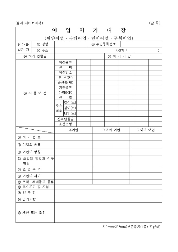 9,000원/월별지제15호 어업허가 대장(원양어업,근해어업,연안어업,구획어업) 양식입니다.