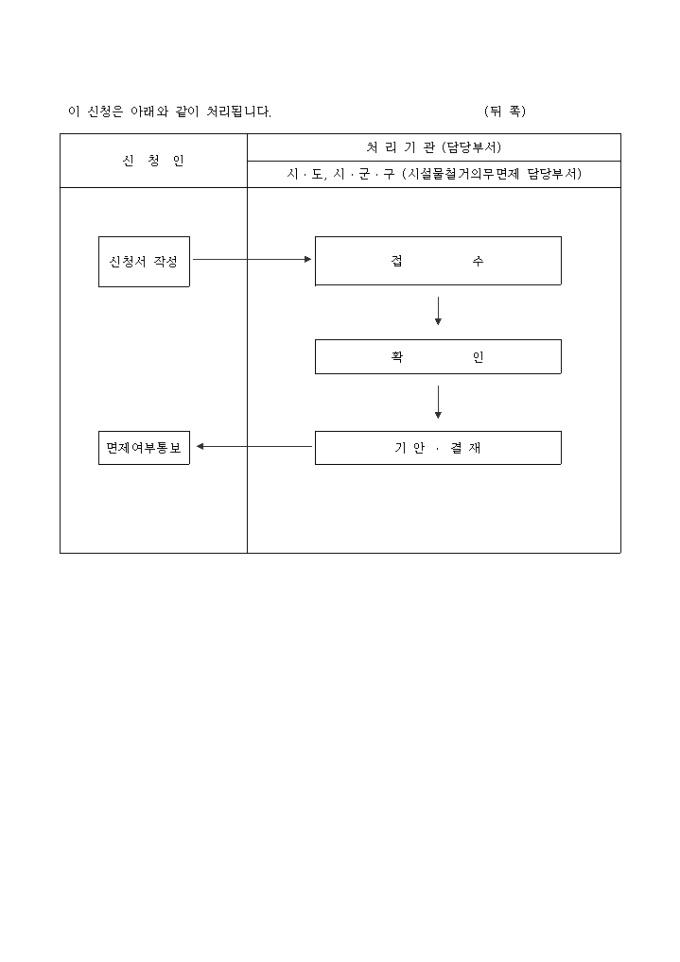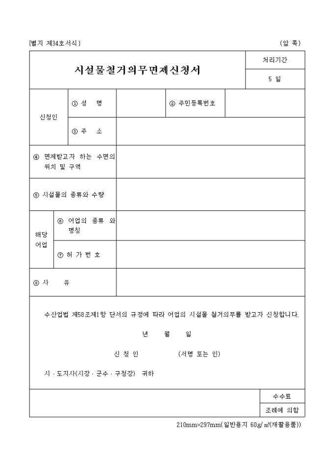 수산업법 제58조제1항 단서의 규정에 따라 어업의 시설물 철거의무를 받고자 신청할 때 사용하는 "별지제34호 시설물 철거의 무면제신청서" 양식입니다.