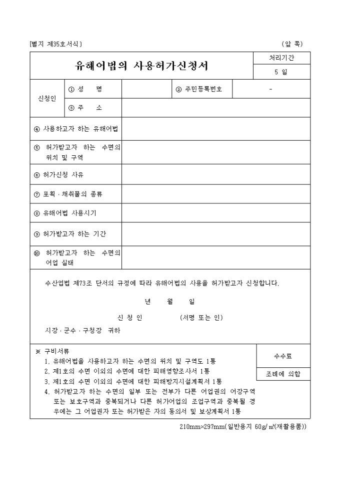 9,000원/월수산업법 제73조 단서의 규정에 따라 유해어법의 사용을 허가받고자 신청할 때 사용하는 "별지제35호 유해어법의 사용 허가신청서" 양식입니다.