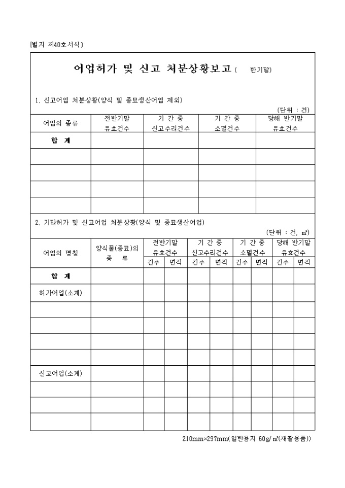 9,000원/월별지제40호 어업허가 및 신고 처분 상황보고(반기말) 양식입니다.