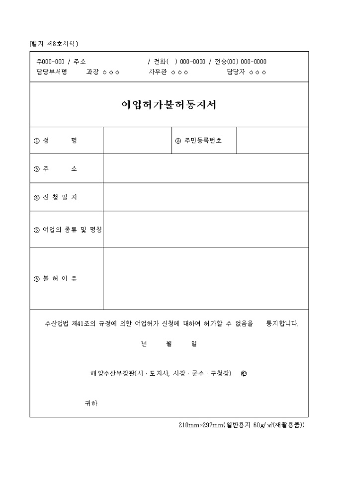 9,000원/월수산업법 제41조의 규정에 의한 어업허가 신청에 대하여 허가할 수 없음을 통지할 때 사용하는 "별지제8호 어업허가 불허통지서" 양식입니다.