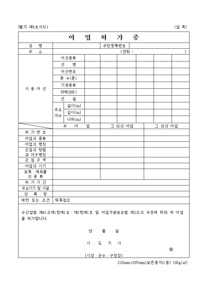 9,000원/월수산업법 제41조제1항제1호․제2항제1호 및 어업자원보호법 제2조의 규정에 따라 위 어업을 허가할 때 사용하는 "별지제9호 어업허가증" 양식입니다.
