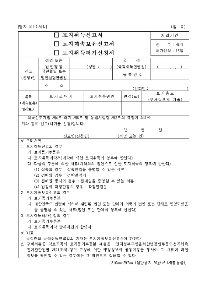 9,000원/월외국인토지법 제4조 내지 제6조 및 동법시행령 제3조의 규정에 의하여 신고(허가를 신청)하고자 할 때 사용하는 "별지 제1호 토지 취득신고서, 토지 계속 보유신고서, 토지 취득 허가신청서" 양식입니다.