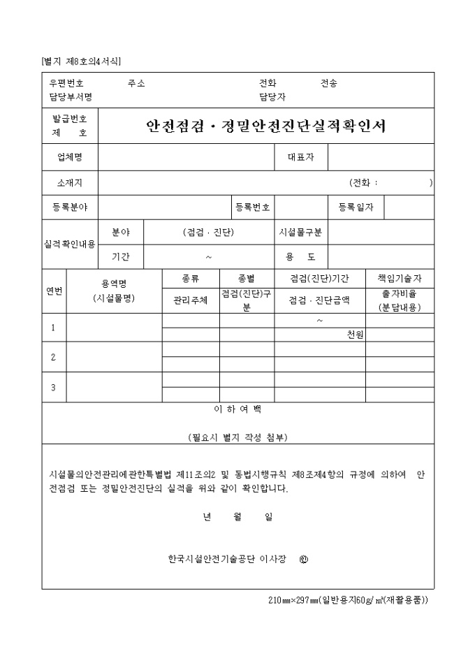 9,000원/월시설물의안전관리에관한특별법 제11조의2 및 동법시행규칙 제8조제4항의 규정에 의하여 안전점검 또는 정밀안전진단의 실적을 확인할 때 사용되는 '별지 제8호의4 안전점검·정밀안전진단 실적확인서' 양식입니다.