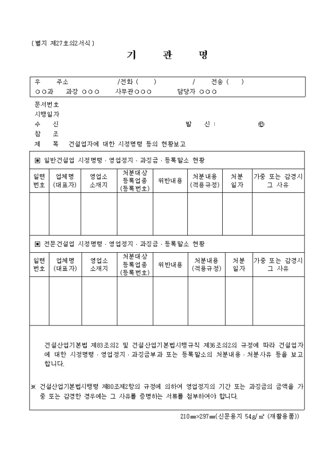 별지 제27호의2건설업자에 대한 시정명령등의현황보고