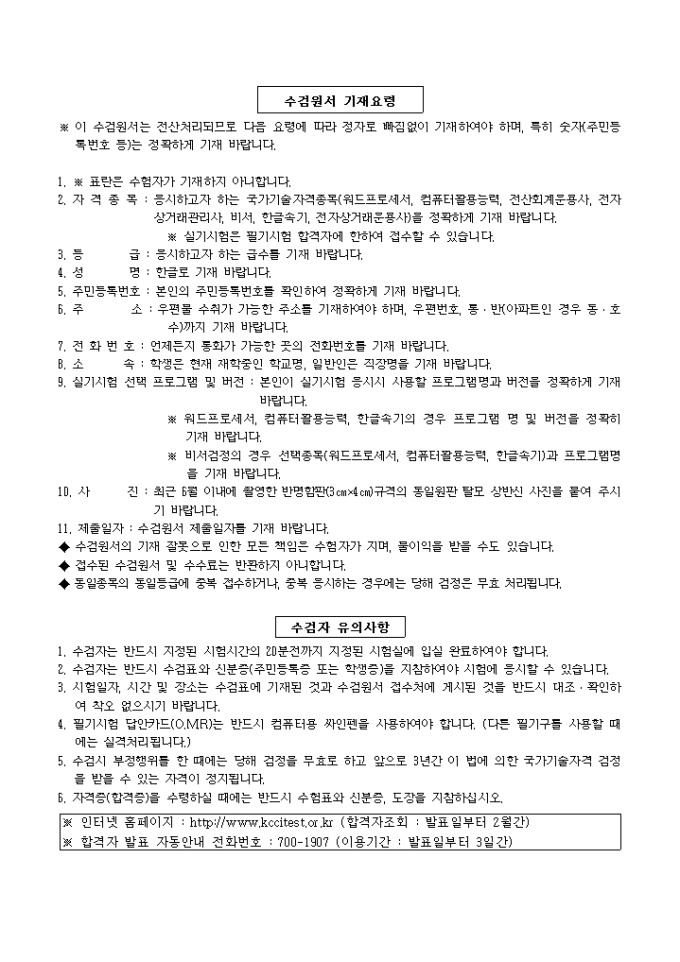 이 수검원서는 전산처리되므로 다음 요령에 따라 정자로 빠짐없이 기재하여야 하며, 특히 숫자(주민등록번호 등)는 정확하게 기재 바랍니다.