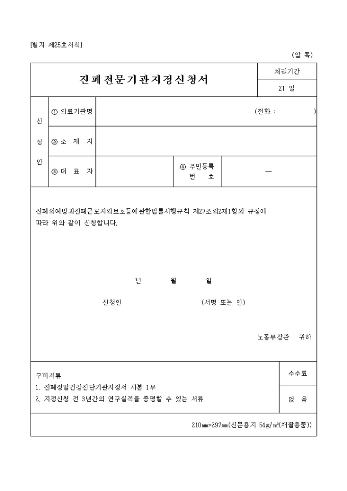 9,000원/월진폐의예방과진폐근로자의보호등에관한법률시행규칙 제27조의2제1항의 규정에 따라 위와 같이 신청하고자 할 때 사용하는 "별지제25호 진폐 전문기관 지정신청서" 양식입니다.