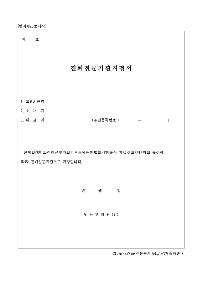 따라 진폐전문기관으로 지정을 증명하는 "별지제26호 진폐 전문기관 지정서" 양식입니다.