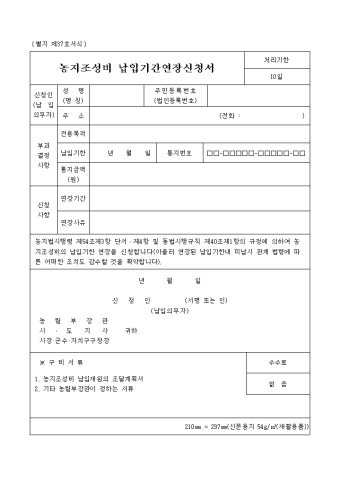 9,000원/월농지법시행령 제54조제3항 단서․제4항 및 동법시행규칙 제40조제1항의 규정에 의하여 농지조성비의 납입기한 연장을 신청(아울러 연장된 납입기한내 미납시 관계 법령에 따른 어떠한 조치도 감수할 것을 확약)하고자 할 때 사용하는 "별지제37호 농지조성비 납입기간 연장신청서" 양식입니다.