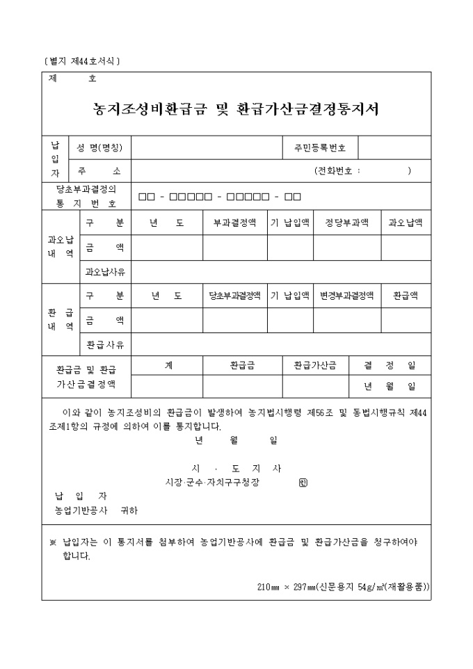 별지 제44호농지조성비환급금 및 환급가산금결정통지서