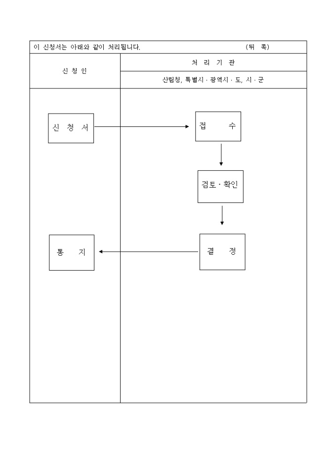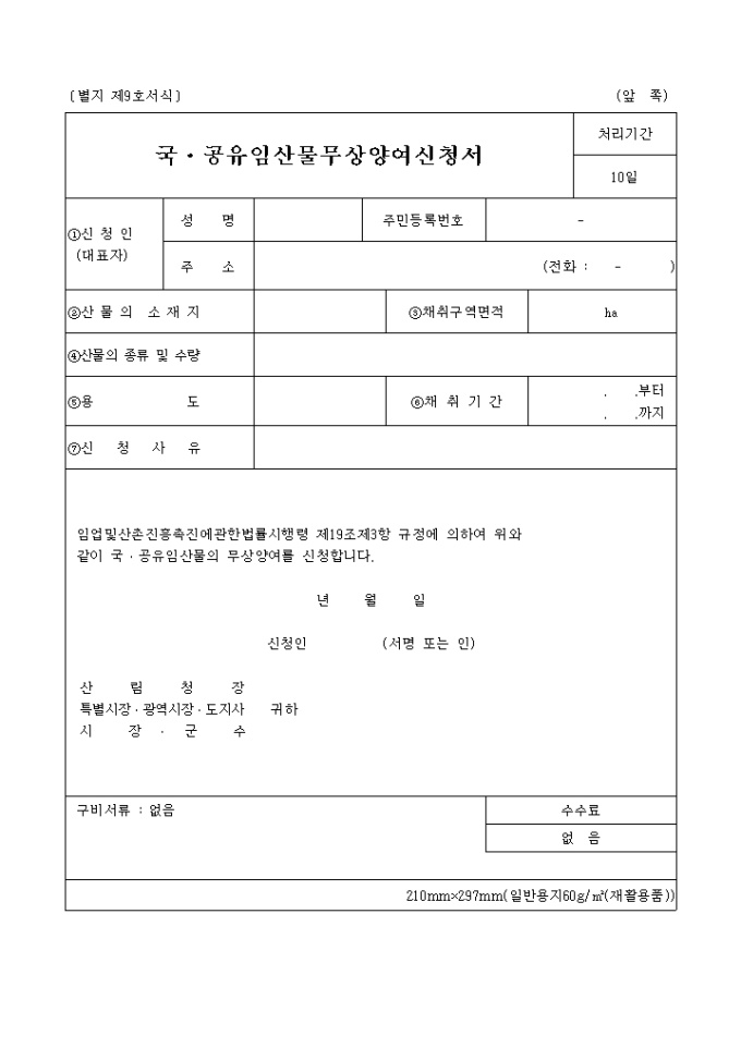 임업및산촌진흥촉진에관한법률시행령 제19조제3항 규정에 의하여 위와같이 국․공유임산물의 무상양여를 신청하고자 할 때 사용하는 "별지제9호 국·공유 임산물 무상 양여신청서" 양식입니다.