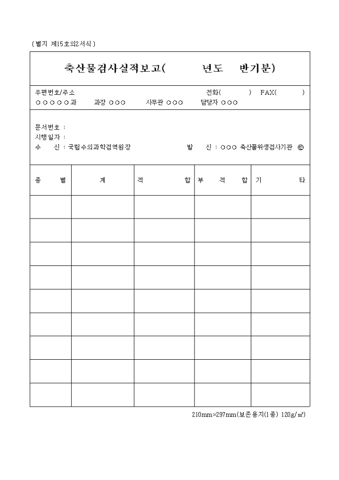 별지 제15호의2축산물검사실적보고(년도반기분)