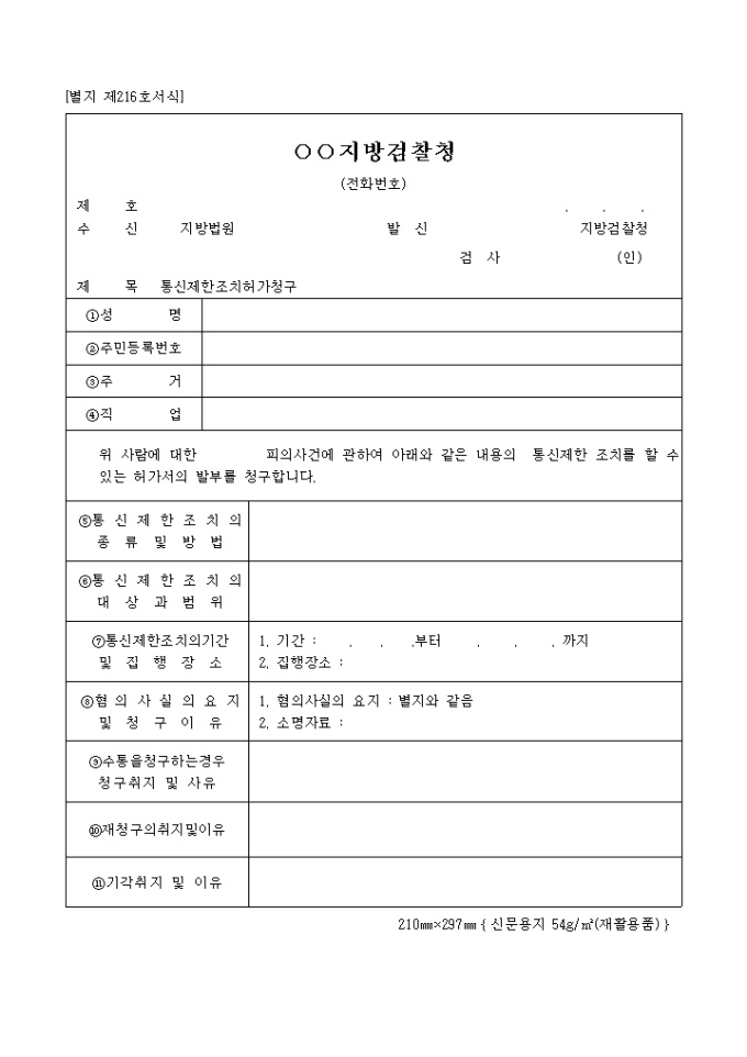 별지 제216호 통신제한 조치허가청구 양식입니다.